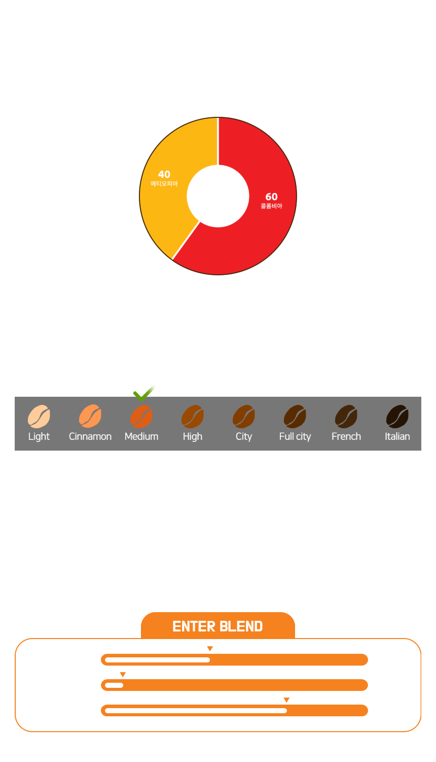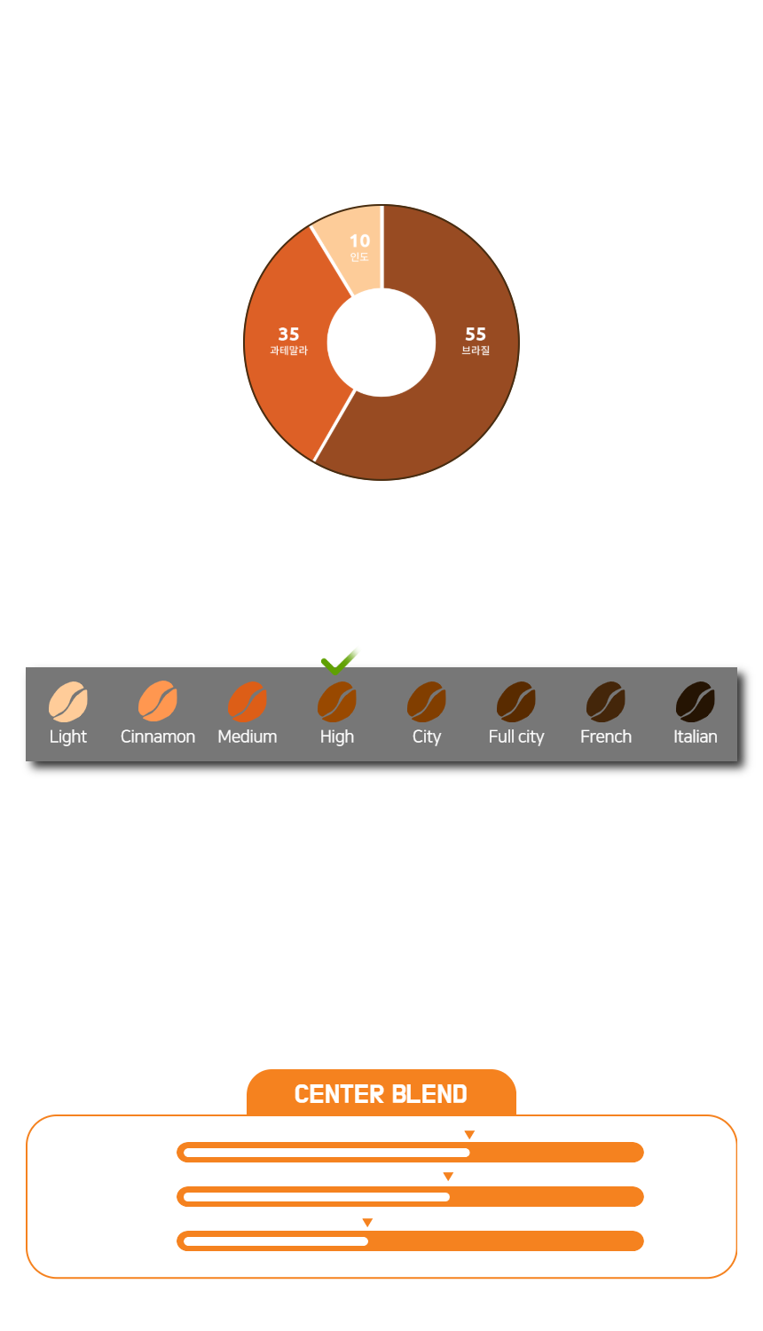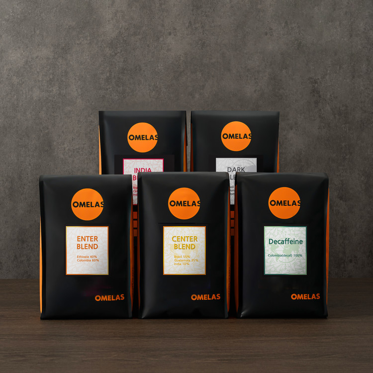 엔터 블렌딩, 센터 블렌딩, 인도 블렌딩, 다크 블렌딩, 디카페인 총 5종류가 있습니다.